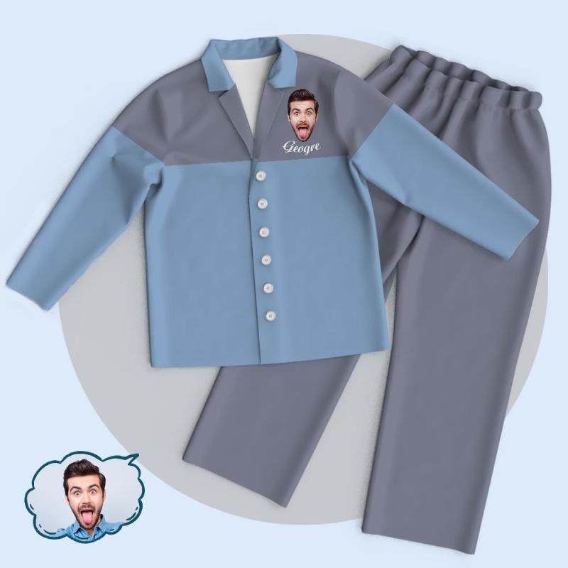 Benutzerdefinierte Blau-graue Colorblock-unisex-cardigan-pyjama-oberteile. Fügen Sie Ihr Foto Und Ihren Namen Hinzu