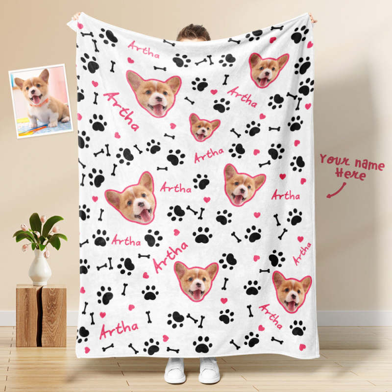 Kundenspezifische Hundegesichts-decke Hundepfoten Und Knochen-stachel-rosa-personalisierte Haustier-foto- Und Text-decke