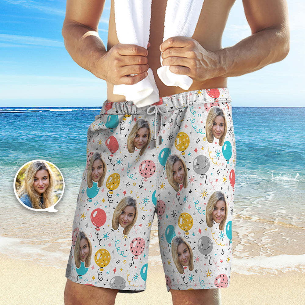 Badehose Mit Individuellem Gesicht, Bunte Luftballons, Personalisierte Strandshorts Mit Foto