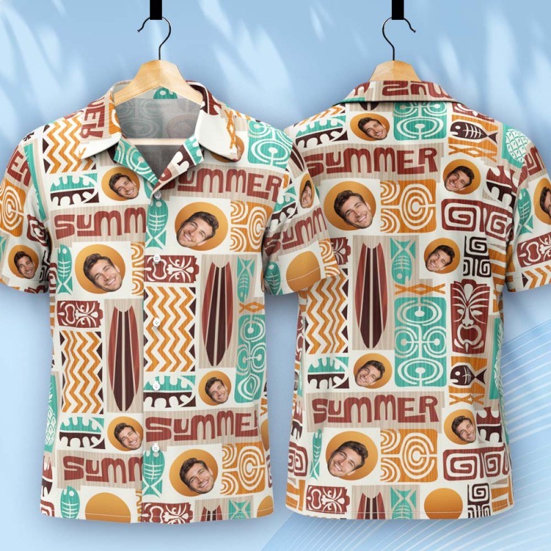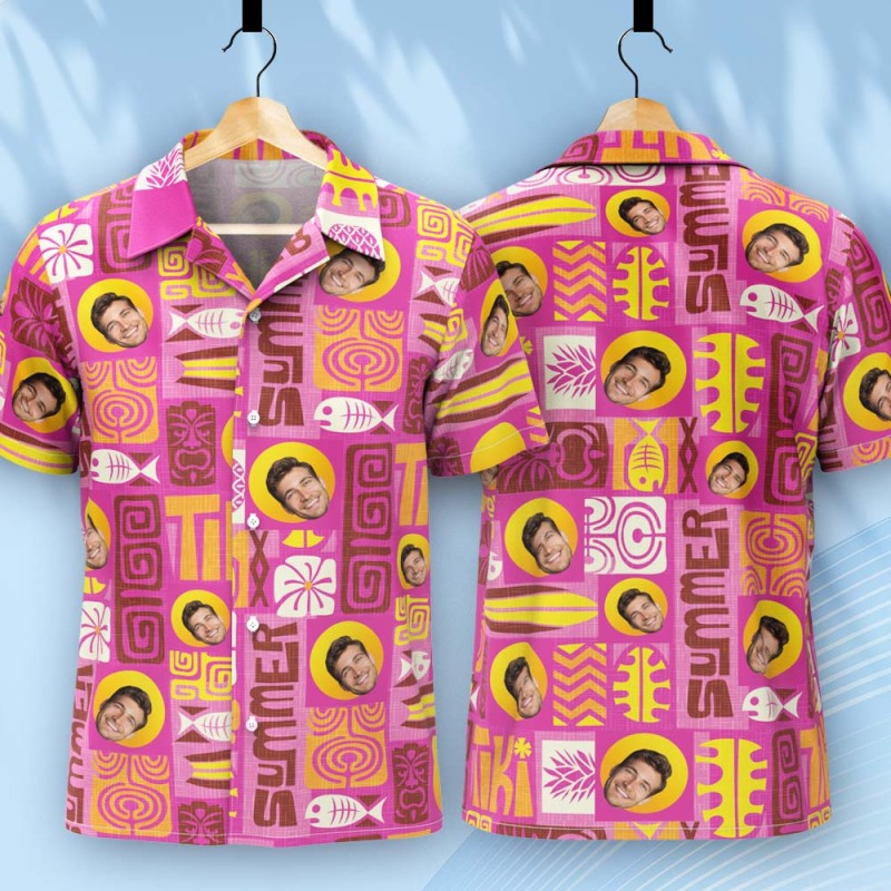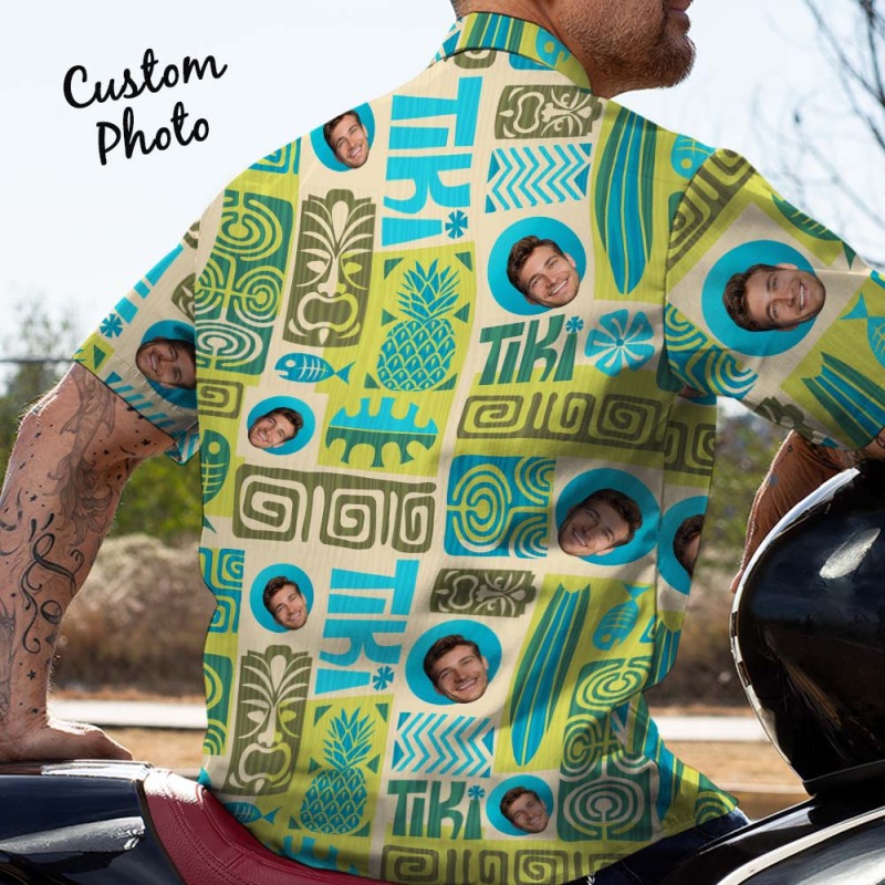 Vater-individuelles Gesicht Mit Exotischem Tiki-muster, Personalisiertes Foto-hawaii-hemd